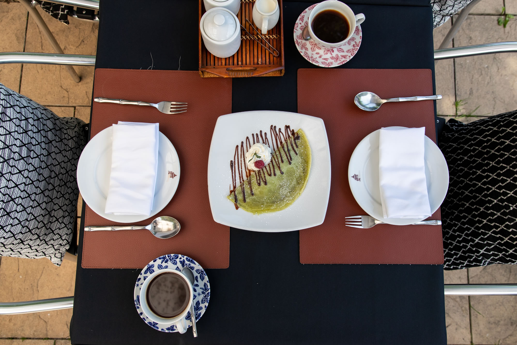 Thai restaurant outdoor patio with black tables covered in black plastic with pink borders, set with wine glasses, surrounded by black and silver chairs, decorated with hanging wicker lamps, greenery, garden plants, and a black railing.